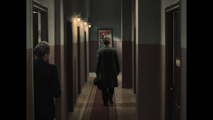 Esses dois movimentos, o de subida e descida, são realizados numa temporalidade esculpida com apuro por Sergei Loznitsa. Não há a menor intenção de deixar o espectador confortável, nem de emular o atual estado do Cinema comercial, com cortes milimétricos de menos de um segundo. Por exemplo, Korniev finalmente se encontra com Stepniak apenas ao fim da primeira meia hora de projeção. O que vem antes é um percorrer infinito de corredores e escadas, portas que se abrem e ato contínuo são trancadas por diferentes guardas, e algumas horas de espera pela boa vontade do diretor do presídio. O mesmo acontece quando Korniev se dirige ao escritório do Promotor Geral. O Promotor vence andares e mais andares para no fim esperar por mais algumas horas para ser a derradeira entrevista do dia.